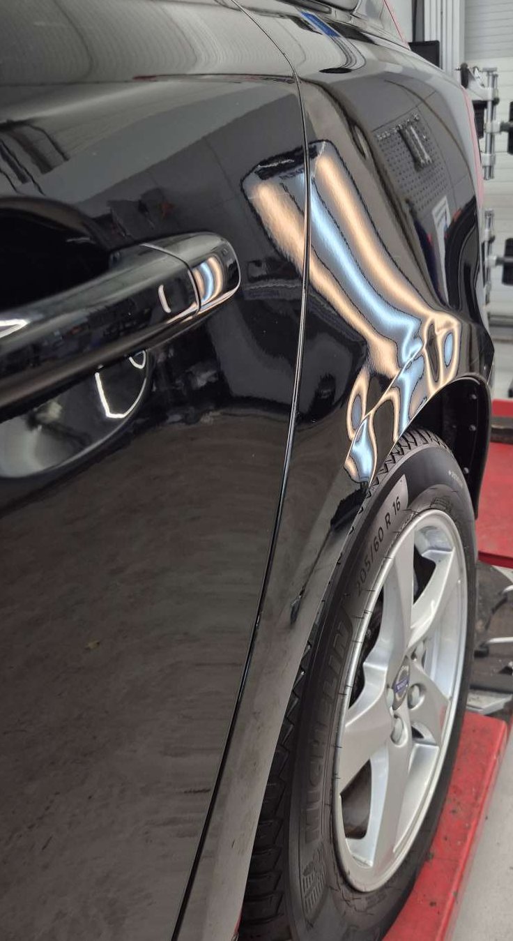 Pittige deuken, vooral omdat het op de rand van het scherm was ingedrukt. En bij deze Volvo is het dubbel en hard, een leuke uitdaging dus! Ook hier herstel zonder spuiten, met behoud van de originele lak.